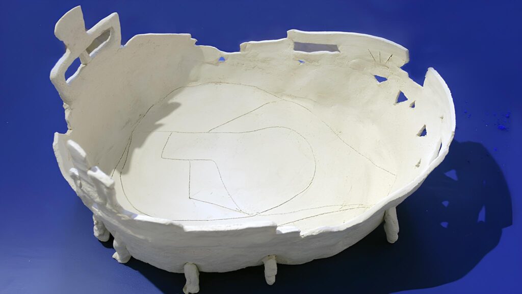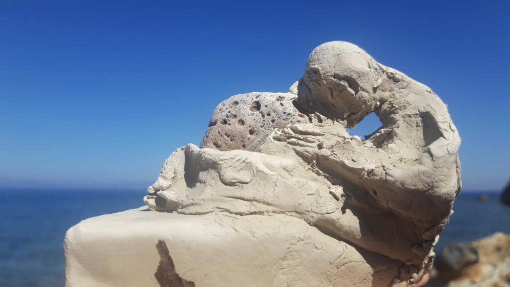 Central to her work are the sculptures-receptors of herbs, made of natural materials such as clay, wood and stone – materials that she collects from the island. Their form and texture function as carriers of memory and energy, as contemporary ritual objects that allude to the healings of the past and the cyclicality of nature. The theory of the Five Elements, her close relationship with Patmos from a young age, as well as her spiritual experiences during her stay at the Monastery of Zoodochos Pigi are deep sources of inspiration for the artist. Translated with DeepL.com (free version)
