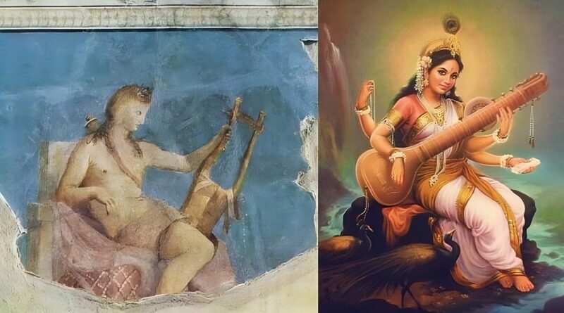 Κοινές ιστορίες αντηχούν και στις δύο παραδόσεις: ένα θεϊκό όργανο ως δώρο στον άνθρωπο. Ο Ερμής χάρισε τη λύρα, όργανο του Απόλλωνα∙ ενώ στην Ινδία, ο Σίβα δημιούργησε τη Ρούντρα Βίνα, το αρχαιότερο έγχορδο όργανο που σχεδιάστηκε μελετώντας το ανθρώπινο σώμα. Όπως στην Ελλάδα ακούμε για τον Ορφέα, που με τη λύρα του μπορούσε να μαλακώσει τα τείχη μιας πόλης, έτσι και στην Ινδία οι Ράγκα θεωρούνται δυνάμεις που επηρεάζουν τον καιρό και αποδίδονται σε συγκεκριμένες ώρες της ημέρας ή εποχές.