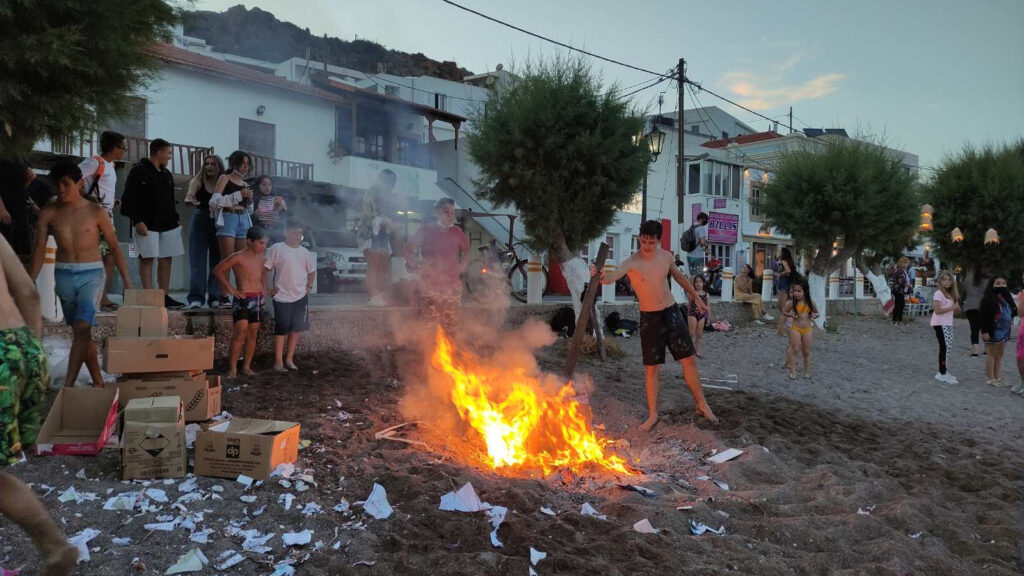 Ένα από τα έθιμα που τηρούνται εδώ στη νησί και εορτάζονται την παραμονή της Ανάληψης είναι αυτό που προστάζει την καύση από τις δάφνες και τα μύρα που κρατήθηκαν από τις μεγαλοβδομαδιάτικες ακολουθίες.