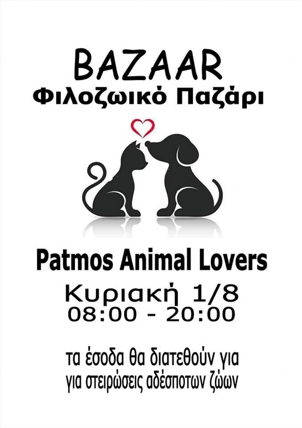 Την Κυριακή 1/8, από το πρωί στις 8:00 έως και το απόγευμα στις 20:00 θα πραγματοποιηθεί στη Σκάλα, στο μικρό παρκάκι ακριβώς απέναντι από το λιμάνι, το καθιερωμένο παζάρι του φιλοζωικού συλλόγου της Πάτμου. Η δράση αυτή είναι αποτέλεσμα της αδιάκοπης προσπάθειας των εθελοντών του συλλόγου με σκοπό να προσφέρουν όσα περισσότερα μπορούν στα ζωάκια του νησιού.