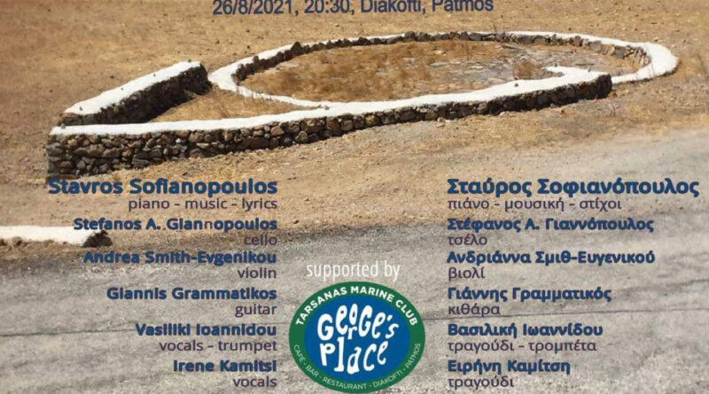 Την Πέμπτη 26 Αυγούστου στις 20:30 στο ανακαινισμένο μικρό αλώνι ακριβώς απέναντι από την είσοδο του καρνάγιου στο Διακόφτι, θα συμπράξει μία ομάδα καλών μουσικών για να μας ταξιδέψει κάτω από τ’ αστέρια. Ο Σταύρος Σοφιανόπουλος θα είναι στο πιάνο, ο Στέφανος Γιαννόπουλος στο τσέλο, η Ανδριάννα Σμιθ-Ευγενικού στο βιολί, ο Γιάννης Γραμματικός στην κιθάρα, η Βασιλική Ιωαννίδου θα τραγουδήσει και θα παίξει τρομπέτα και η Ειρήνη Καμίτση στο τραγούδι. Η εκδήλωση πραγματοποιείται με τη στήριξη του Tarsanas Marine Club – George’s Place.