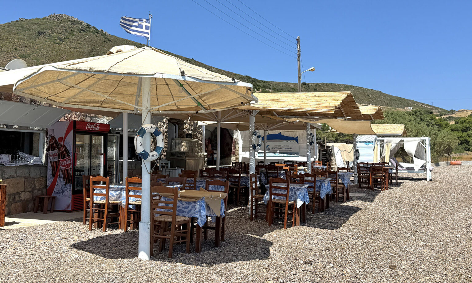 Το ουζερί-μεζεδοτεχνείο “Φαληράκι” βρίσκεται στην παραλία της Σκάλας με τραπεζάκια μέχρι το κύμα.